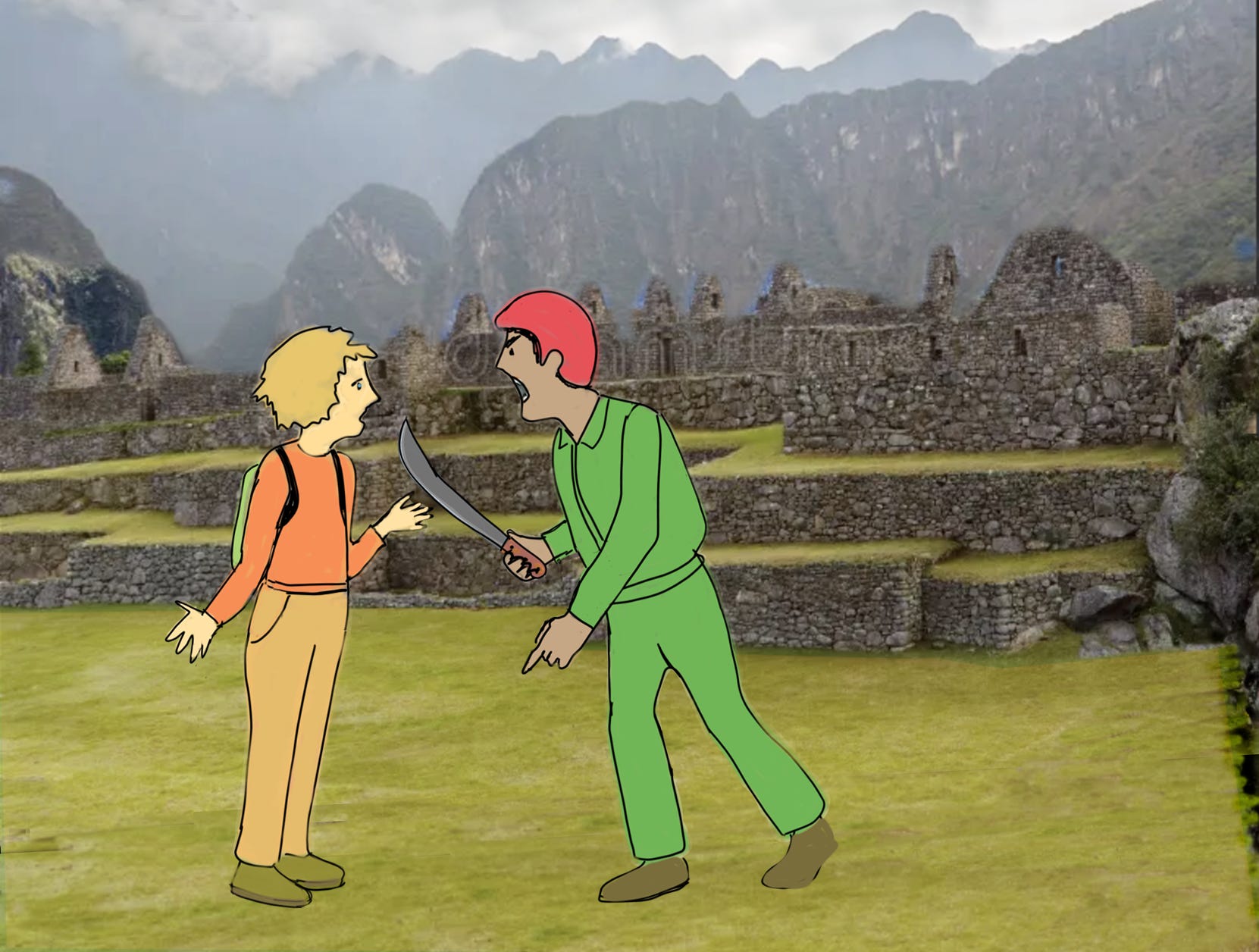 I had no strength to outrun him, no magic words to escape him, no jet-pack to whisk me away. My promise to return to the Sun Gate served only to infuriate the guard. Clenching his fists, he insisted that he knew that I was planning to sleep in the ruins. No, I said, as a lover of archaeology, I had no such intention. Abajo! he shouted, pointing to the Rio Urubamba, 1000 feet below us. Arriba, I said, turning to retrace my steps. He blocked my path, pulled a machete from behind his back, and held it to my throat. (100)