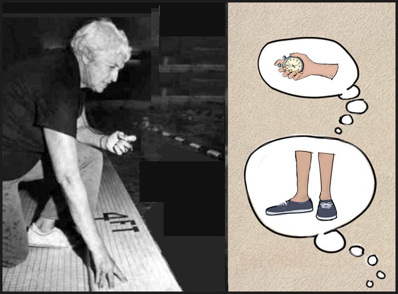 I was once a nine-year-old, clueless water rat. Five years later, thanks to Betty Philcox, I was nationally ranked, practicing with the Yale Men’s Team, and saying no to trying out for the Tokyo Olympics. Her mission was to turn swimmers into blue-ribbon athletes and model team players. Her year-round, even-keeled discipline counterbalanced my freewheeling, rule-free home. I can still see her thin ankles and flat sneakers, following me along the pool’s edge. I can still hear her voice and the click of the stopwatch in her hand. I can still see Betty as a stranger waiting on the beach. (100)